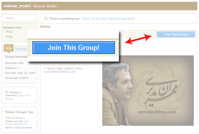 عضویت در گروه هواداران مهران مدیری، ابتدا به آدرس گروه مراجعه کنید : 2- مطابق شکل زیر بر روی کلید Join this Group کلیک کنید :