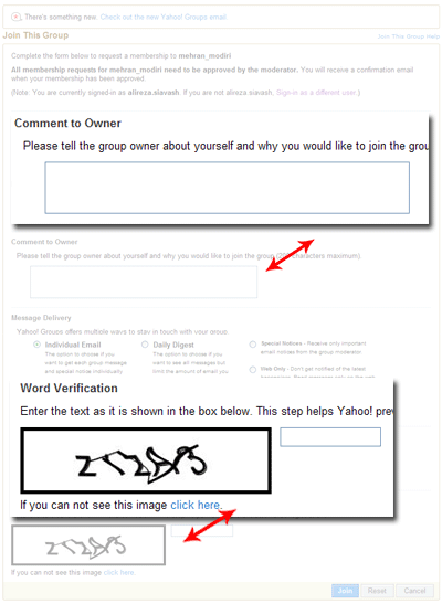 4- در مرحله بعد و در قسمت Comment to Owner جمله کوتاهی خطاب به مدیری گروه بنویسید (هدف خود از عضویت در این گروه یا ...) - در قسمت Word Verification نیز مطابق حروف و اعدادی که در کادر پایین نمایش داده بخش مربوطه را پر کنید. توجه داشته باشید که حروف بزرگ و کوچه را عینا وارد نمایید.
